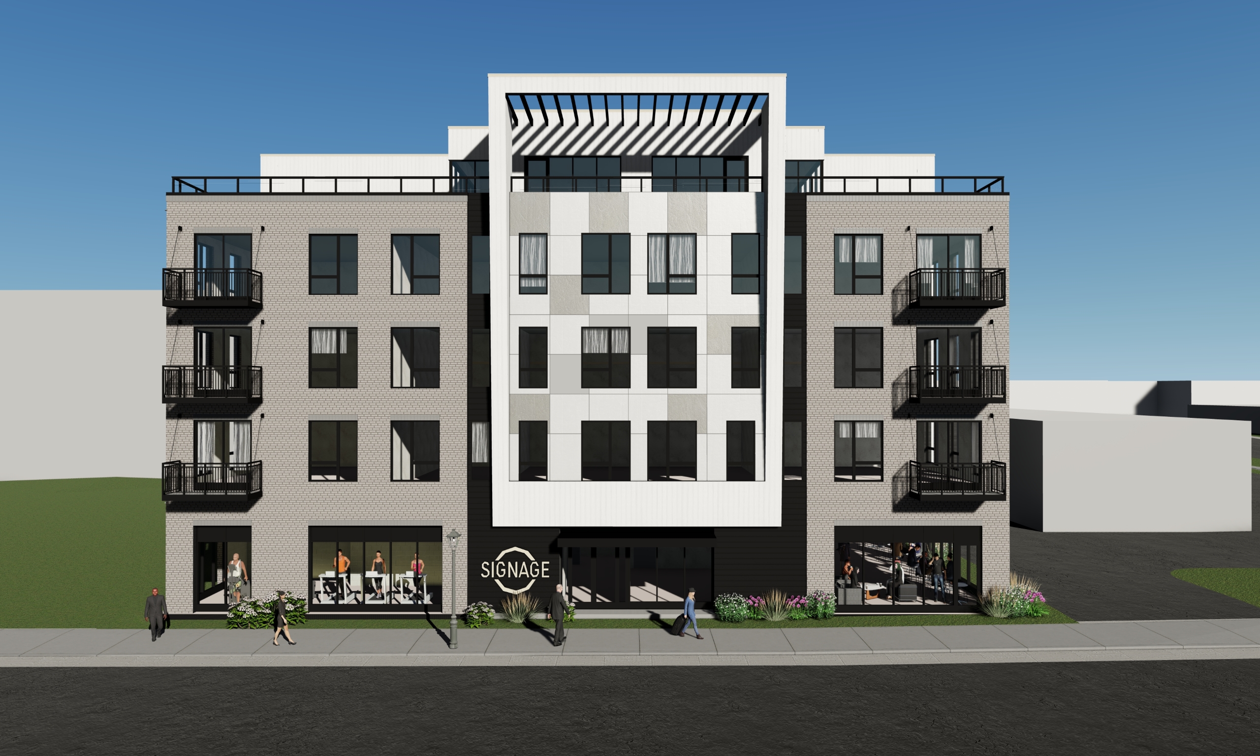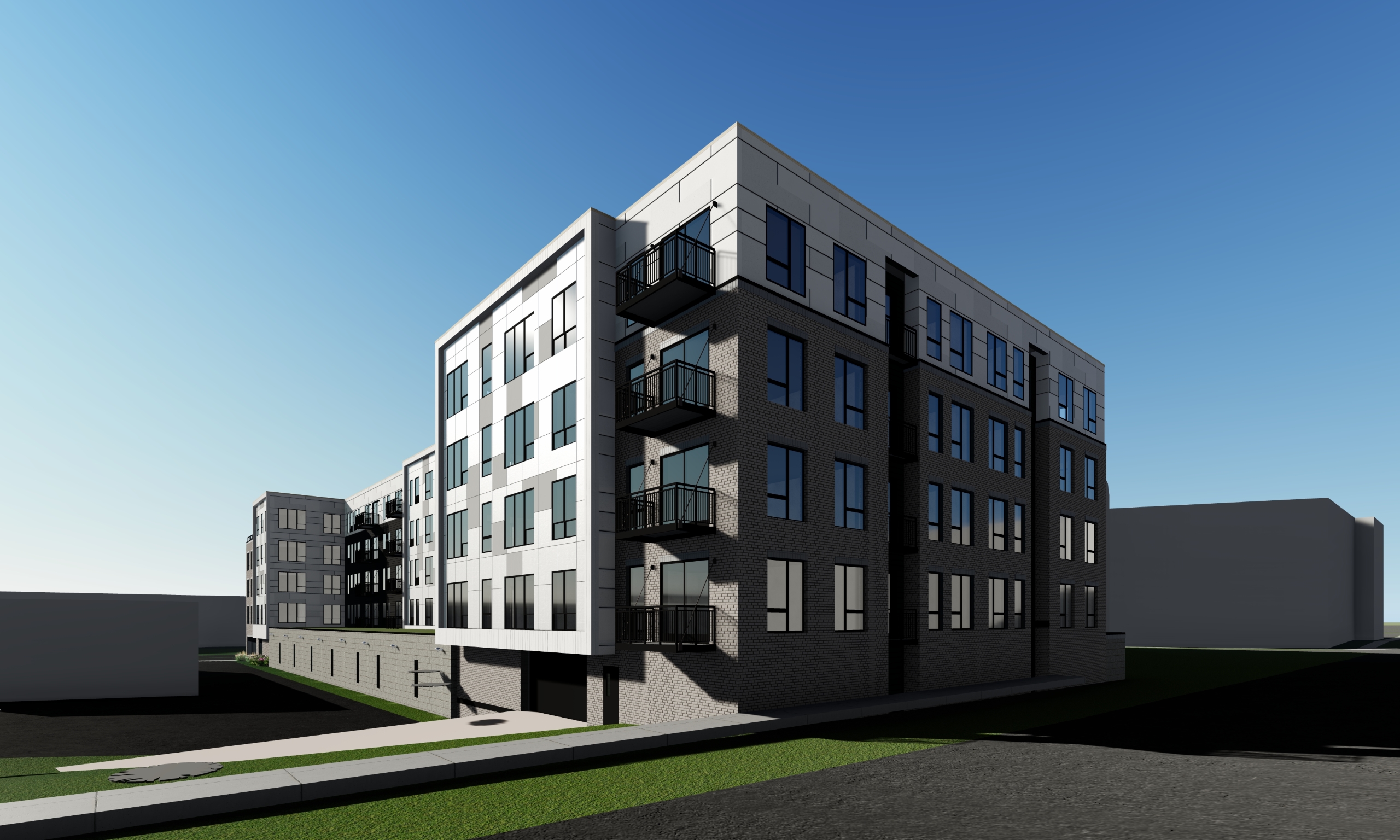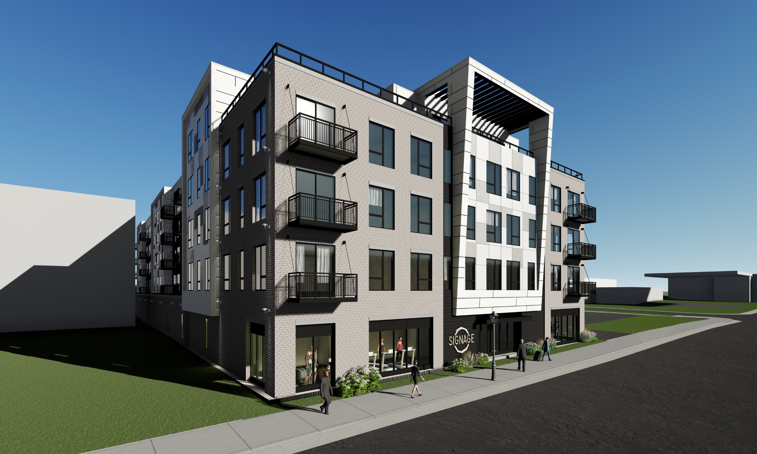 The primary structure of the building is a 1-story precast concrete podium with a 4-story insulated wood framing. the exterior envelope provides materials such as fiber cement panels, burnished block, brick veneer and metal panel siding.